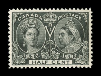 1667 nh 50 image#50, 1897 1/2c Jubilee, exceedingly well centered mint single, marvelously intense black color on fresh white paper, unblemished o.g., n.h., extremely fine; photocopy of a 1997 PF certificate for a block of four, this being the bottom right stamp (Unitrade C$450.00). (Image) $300.00