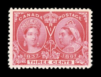 1669 nh 53 image#53, 1897 3c Jubilee, lovely mint single being extraordinarily well centered within lavishly large margins, lovely fresh color on bright paper, o.g., n.h., extremely fine gem (Unitrade C$75.00). (Image) $37.50