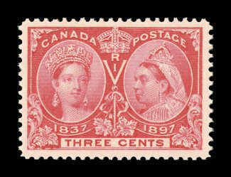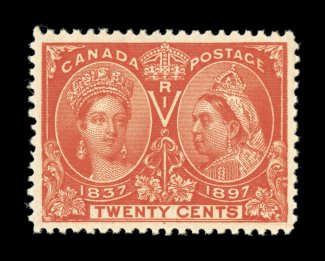 1680 og Unitrade #59i imageUnitrade #59i, 1897 20c Jubilee in the deep vermilion shade, exceedingly well centered within large margins, gorgeous radiant color and an outstanding impression, o.g., lightly hinged, extremely fine; 1998 CPES certificate as n.h. (Scott $200.00 for normal vermilion shade). (Image) Unitrade C$325.00