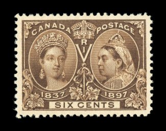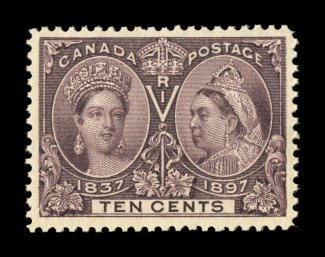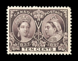 1677 nh 57 image#57, 1897 10c Jubilee, exceptionally well centered amid large even margins, particularly deep intense color and a strong vivid impression, o.g., n.h., small gum bend; extremely fine (Unitrade C$450.00). (Image) $250.00