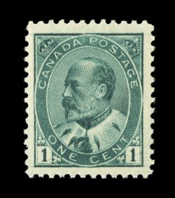 1721 nh Unitrade #89iv imageUnitrade #89iv, 1908 1c Deep blue green, with hairlines in the bottom margins being unusually strong and clear, pristine fresh with particularly deep color on bright white paper, exceptionally well centered within large margins, o.g., n.h., extremely fine; 1999 CPES certificate. (Image) Unitrade C$240.00