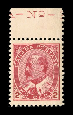 1723 nh Unitrade #90vii imageUnitrade #90vii, 1903 2c Carmine, Ty. I, attractive top sheet-margin partial plate number single, extraordinarily well centered within four wide well balanced margins, radiant color and prooflike impression, pristine o.g., stamp is n.h., extremely fine; the two types, which are very distinctive, are only listed in Unitrade with type I being the scarcer by far (Scott for normal $50.00). (Image) Unitrade $225.00