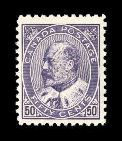 1726 nh 95 image#95, 1908 50c Purple, a striking gem quality mint example of this high value, wonderfully bright and fresh, with rich luxuriant color and a razor-sharp impression on bright white paper, well centered within extra-large margins, unblemished o.g., never hinged, extremely fine; a rare and seldom encountered stamp in this stellar condition (Unitrade C$3,000.00). (Image) $1,450.00