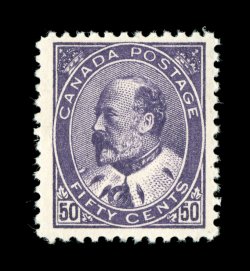 1727 og Unitrade #95i imageUnitrade #95i, 1908 50c Deep purple, fresh mint single with exceptionally rich color, quite well centered, o.g., only the barest trace of hinging, very fine; 1999 CPES certificate for a block of four, this being the bottom left stamp (Scott for normal shade $650.00). (Image) Unitrade C$1,100.00