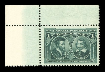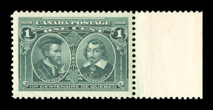 1728 nh 97 image#97, 1908 1c Tercentenary, an impressive right sheet-margin jumbo mint single possessing immense boardwalk margins, plus wonderfully well centered within these massive borders, especially deep luxuriant color and a well incised impression, unblemished o.g., n.h., extremely fine and seldom found so large; 1998 CPES certificate (Unitrade C$75.00). (Image) $35.00