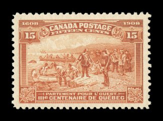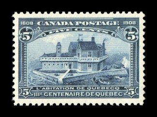 1730 nh 99 image#99, 1908 5c Quebec Tercentenary, highly select mint single, remarkably well centered within extraordinarily large margins, deep intense color and impression on brilliantly white paper, immaculate o.g., n.h., an extremely fine gem (Unitrade C$270.00). (Image) $140.00