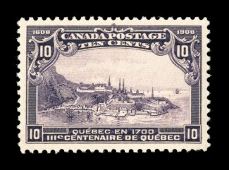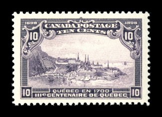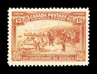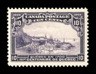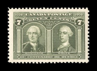 1732 nh 100 image#100, 1908 7c Quebec Tercentenary, an especially handsome mint single, being marvelously fresh, extraordinarily well centered amid extra-large to huge margins, plus its color is strong and rich, and its impression is razor sharp on fresh white paper, o.g., never hinged, extremely fine; 1998 CPES certificate (Unitrade C$600.00). (Image) $310.00
