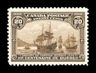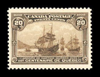 1738 nh 103 image#103, 1908 20c Quebec Tercentenary, pristine mint single, uncharacteristically well centered within very large margins, rich color, o.g., never hinged, extremely fine and choice example of this high value;1998 CPES certificate (Unitrade C$900.00). (Image) $500.00