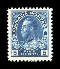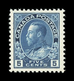 1749 nh 111 image#111, 1914 5c Dark blue, unusually choice mint single, featuring lovely centering amid uncommonly wide margins, sumptuously rich color and a sharp impression, flawless o.g., n.h., extremely fine (Unitrade C$600.00). (Image) $300.00