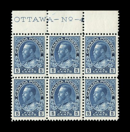 1751 og/nhbl 111 image#111, 1914 5c Dark blue, top sheet margin block of six with "Ottawa" imprint and plate "No - 4", overall quite well centered for a block, intense deep color on bright white paper, o.g., h.r. in top center stamp, the other five stamps are n.h., fine-very fine; catalog values are for one hinged and five n.h. singles (Unitrade C$1,150.00+ for grade of only fine). (Image) $1,620.00+