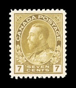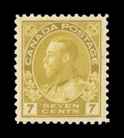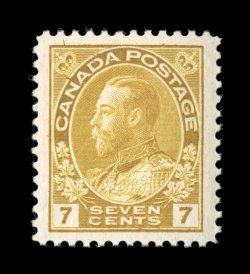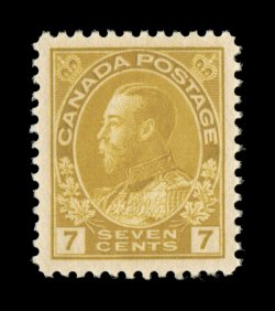 1756 nh 113 image#113, 1912 7c Yellow ocher, wet printing, a choice mint single, featuring mathematically precise centering amid large margins, sumptuously rich color and a deeply etched impression, flawless o.g., n.h., an extremely fine gem (Unitrade C$210.00). (Image) $105.00
