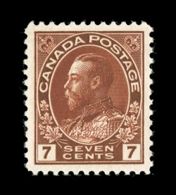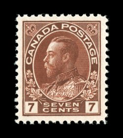 1758 nh 114 image#114, 1924 7c Red brown, dry printing, a choice mint single, featuring mathematically precise centering amid large lavish margins, sumptuously rich color and a deeply etched impression, flawless o.g., n.h., an extremely fine gem (Unitrade C$90.00). (Image) $52.50