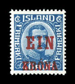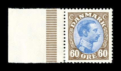 1803 og/nh 120/127 image#120, 123a, 124-27, 1915-20 50o-90o King Christian X, six different, including the scarce 60o brown and ultramarine (with photocopy of Nielsen opinion for the block from which this came), bright fresh colors, o.g., #123a with a small h.r., others never hinged, very fine group. (Image) $336.00