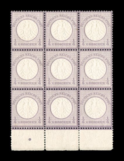 1805 og/nhbl 14 image#14, 1872 1/4gr Violet Large Shield, impressive mint bottom sheet-margin block of nine (3x3), attractive in a lovely light pastel shade, each stamp is well centered with full even perforations, full fresh o.g., top left stamp lightly hinged, bottom selvage has some sensible hinge reinforcement of a few separated perforations, the other eight stamps are never hinged and "post office" fresh, very fine and choice; a remarkably scarce block in such premium condition, its value is properly reflected by the catalog value totals of one hinged and eight never hinged singles; 2001 Sommer BPP certificate (Michel #16; €2,490). (Image) $1,462.50+