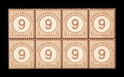 1807 og/nhbl 28 image#28, 1874 9kr on 9kr Brown Large Shield, very pretty mint block of eight (4x2), possessing fresh bright color on white paper, well centered with crisp perforations, full o.g., neatly hinged in the top corner stamps, the other six stamps are never hinged, very fine-extremely fine; catalog values are for two hinged and six never hinged singles; 2001 Sommer BPP certificate. (Image) $910.00+