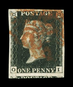 1808 O 1 image#1, 1840 1p Black, plate 6, position O-I, used single with large to extra-large margins all around, showing a portion of the next stamp below, red Maltese cross cancel, choice very fine (S.G. #2; £275). (Image) $275.00