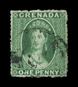1813 O 7Ac image#7Ac, 1875 1p Yellow Green, perf. 15, wmk. large star, a marvelously well centered example of this extremely rare stamp, with perforations well clear of the design all around, "B" cancel of Victoria dated October 1877, extremely fine; this rare stamp resulted because of a tiny printing in perforation 15 by Perkins Bacon to replace some poorly perforated 14 sheets by Somerset House, all 4,800 of the stamps were sent to Grenada, but few have survived, a census of known examples revealed ten used singles, a used strip of four and an unused single, this being among the best centered of this small population; 2006 RPS certificate (S.G. #15; £2.250). (Image) $2,600.00
