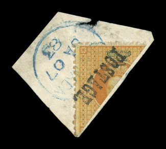 1814 O 14a image#14a, 1883 Half of 1p Orange revenue with provisional "Postage." overprint, unsevered pair, scarce used example with portion of blue c.d.s., quite well centered for this, couple of uneven perforations at top, otherwise fine; even used pairs used as 1p values are scarce with less then a couple dozen known; clear 2006 RPS certificate (S.G. #28a; £1,200) (Image) $1,500.00