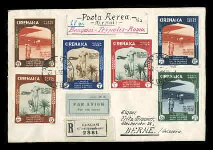 1818 c imageItalian Colonies Second Colonial Exhibition covers, eight different complete sets of the postal issues and air mail sets for Cyrenaica, Eritrea, Somalia and Tripolitania, each set on matching attractive registered cover to Switzerland, stamps are all fresh and well centered, covers with the appropriate transits and backstamps, fine-very fine. (Image) Est. 500-750