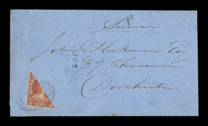 1819 c 9a image#9a, 1860 10c Vermilion, diagonal half used as 5c, neatly tied to petite cover by numeral "1" grid of St. John with that city's July 26, 1860 c.d.s. on the reverse, posted to Dorchester, New Brunswick with light receiving c.d.s. of the next day on front and back, stamp well centered with clipped perfs. at bottom, very fine bisect cover (Unitrade C$1,000.00). (Image) $675.00
