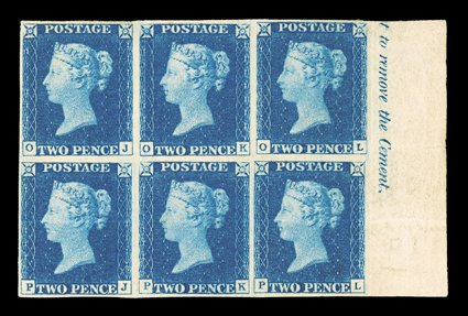 41 ogbl imageOJ-PL, Plate 1, a striking right sheet-margin mint block of six (3 x 2), showing "t to remove the Cement." partial inscription in the full sheet selvage at right, other margins full and marvelously well balanced, brilliant color and impression on especially bright paper, position OK being the shifted transfer variety and all P squares recut, o.g., two horizontal creases (one passing through each horizontal strip) that in no way detract from the overall magnificent appearance of this very rare and important multiple; among the most eye-appealing of the few existing marginal Two Pence mint multiples; signed Enzo Diena and accompanied by his 1991 certificate, as well as being signed by Peter Holcombe and accompanied by his 1991 certificate; ex-Atkinson. (Image) Est. $50,000-75,000