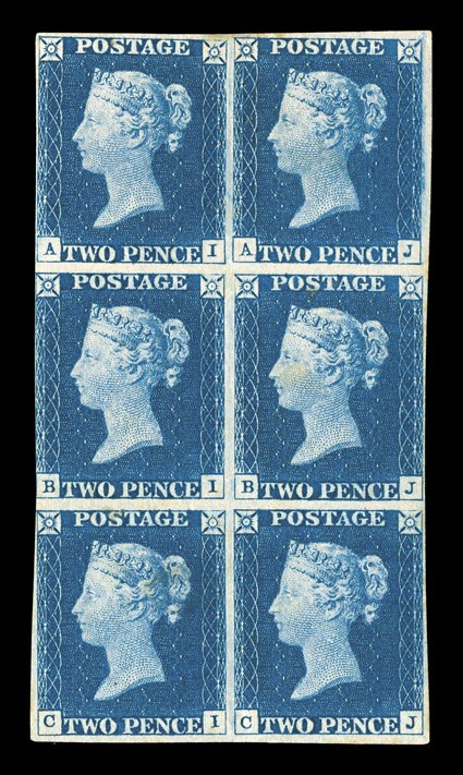 42 ogbl imageAI-CJ, Plate 1, a brilliant mint block of six (2 x 3), an especially deep shade and radiant prooflike impression, close to large margins virtually all round except BI touched at left, much original gum, two light central diagonal creases and CI has a thin, overall in a wonderfully fine and fresh state of conservation; a ravishing mint multiple of this great classic stamp; 1965 BPA certificate; ex-Cooley, Pichai. (Image) Est. $30,000-40,000