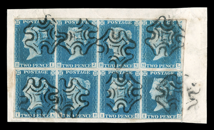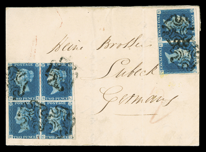 50 c imageAK-AL horizontal pair from the top right corner of the sheet and BK-CL block of four from the right of the sheet, Plate 2, both tied to remarkable folded entire from Newport to Lubeck, Germany, both the pair and block with full to large margins (but just touched at one point at bottom of each), deep rich color, black Maltese Cross cancels tie stamps, "Newport-Mon/My 18/1841" double ring c.d.s on reverse along with London transit (May 19) and May 24 arrival marking, rated "2" in red crayon, a very fine and famous cover to an enormously rare destination; 1998 RPS certificate; ex-Meroni, Seymour, Shaida and Pichai. (Image) Est. $20,000-30,000