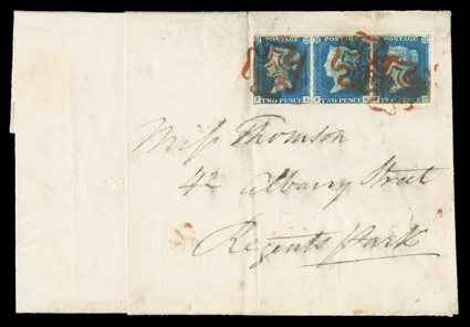 44 c imageFA-FC, Plate 1, horizontal strip of three tied to large size folded letter addressed to Regents Park by red Maltese Cross cancels, clear black circular "Q/MY-12/1840" rare early May date cancel, along with red boxed May 13, 1840 receiving handstamp on reverse, strip with close to ample margins (just touching at a few points), letter has been refolded extensively to both improve appearance and to fit an exhibition page, some soiling and light running of address ink, nevertheless this is a rarely seen early May date usage, particularly with a franking larger than a single. (Image) Est. $4,000-5,000