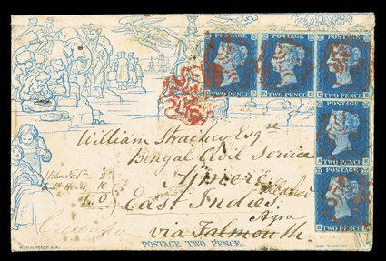 45 c imageAE-BE vertical pair and DC-DE horizontal strip of three, Plate 1, uprating a Mulready 2p envelope, a209, to India (slightly refolded at top to its original pre-use position), from Bristol (30 Sept. 1840) to Ajmeer redirected to Agra via Bombay and Cawnpore, both the pair and strip of three have ample to large margins and possess rich bright blue color, pre-printing or application wrinkles, clearly cancelled and well tied by Maltese Crosses in red, showing origin, transit, and arrival d.s. all on reverse; one of the great uprated Mulready covers and an exhibition item of the highest echelon, of the two recorded uprated Mulready usages to India this is by far the finer; 1996 BPA certificate; ex-"Daisy", Pichai. (imagea) (Image) Est. $40,000-50,000