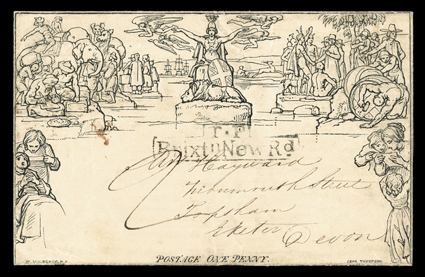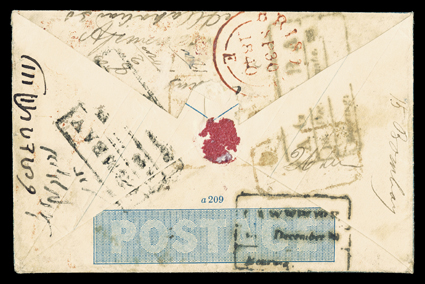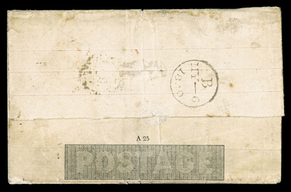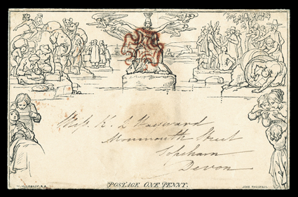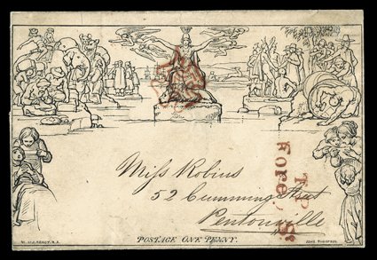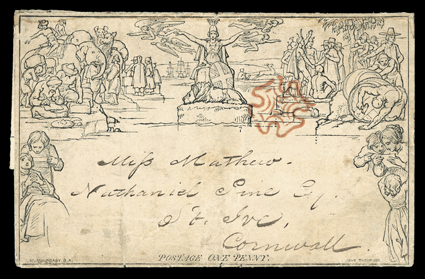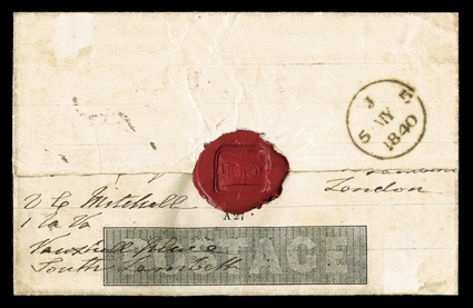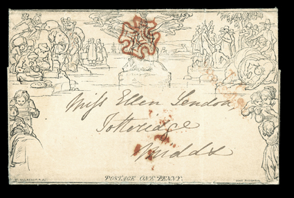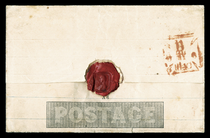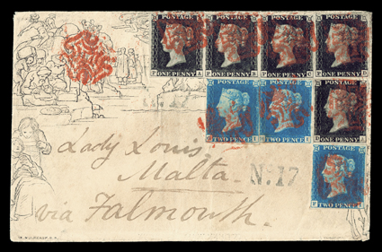 53 c imageThe extraordinary "Lady Louis" uprated Mulready envelope to Malta, envelope (A151) addressed to Lady Louis, Malta and inscribed via Falmouth, bearing 1p Black, DA, Plate V (state 2) single, a 1p Black, PA-PD horizontal strip of four, Plate 1, plus 2p Blue FI, GI and HI singles, Plate 1, mostly with margins all around, all cancelled by striking and distinctive orange Maltese Cross cancels of Bristol and with corresponding "Bristol/JA 9/1841" backstamp, "No. 17" black handstamp on the front of the cover below stamps, two stamps slightly repaired and address panel a bit toned; this stunning and incredibly rare cover has long been regarded as one of the most important postal history rarities of Great Britain and is perfectly suited for exhibition; 1998 BPA certificate; ex-Grunin. (Image) Est. $75,000-100,000