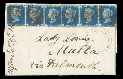 46 c imageCC-CE and AF-AH, Plate 1, two horizontal strips of three tied to lovely 1840 double letter sheet to Malta, from the famous Lady Louis correspondence, each strip with margins just touching to full, deep rich colors, all cancelled with indistinct red Maltese Cross cancels, sent from Clifton (manuscript dated "Clifton Oct. 9th 1840" at left) and with Clifton dumb handstamp in black, manuscript "Via Falmouth" below address, backstamped Bristol in red, the letter sheet itself is quite neat and clean, very fine; an eye-appealing and rare overseas usage to Malta from a well known correspondence; 1994 BPA certificate. (Image) Est. $15,000-20,000