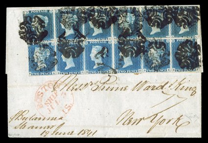 47 c imageBA-BF and BG-BL, Plate 1, two horizontal strips of six, cut from the same complete row, varying margins, pale blue shade, tied to impressive 1841 (18 June) folded entire from Liverpool to New York, boldly cancelled by Maltese Crosses in black and showing "Boston/SHIP/July 3/Ms." c.d.s. in red adjacent, with origin double-ring d.s. on reverse, endorsed "Britannia Steamer 12 June 1841", lower strip lifted and reaffixed in its original position; a spectacular 2/- double rate Trans-Atlantic cover and the highest recorded franking for a cover sent abroad with this plate, a remarkable showpiece; signed Enzo Diena and accompanied by a 1998 RPS certificate; ex-Hunt, Pichai. (Image) Est. $20,000-30,000