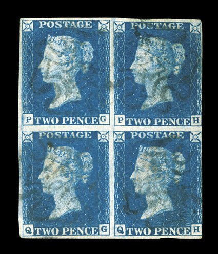 48 Obl imagePG-QH, Plate 2, an exceptional used block of four, possessing large even margins on three sides, fourth margin clearing but close, deep rich color, very light and unobtrusive black Maltese Cross cancels, faint bend between top and bottom pair, very fine; an exceedingly rare block in far superior quality than normally found; ex-Cooley. (Image) Est. $10,000-15,000