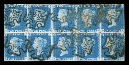49 Obl imageDG-KK, Plate 2, a showpiece used block of ten (5 x 2), with margins all around except just touching at one point on EG, pale blue shade, black Maltese Cross cancels, block with some minor surface rubbing on two stamps and a vertical crease through DK/EK, still quite fine and handsome for such a large multiple; signed by both Enzo Diena and Peter Holcombe, also accompanied by the latter's 1991 certificate; ex-Atkinson. (Image) Est. $15,000-20,000