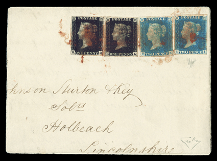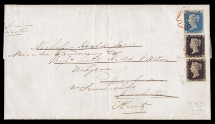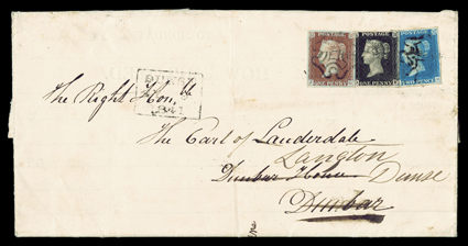 51 c imageTwo 1p Black singles, FK and GC, Plate 1a and 2p Blue, AC, Plate 1, all tied to handsome large folded letter from London (28 May) to Manchester and readdressed (as requested in the contents of the letter) without further postage to Ashgrove, Herts., stamps with ample to large margins and beautifully tied by red Maltese Cross cancels, London datestamp on reverse, cover has been slightly refolded at left, 2p with small sealed cut, overall a very fine mixed franking, which is especially rare and desirable in this choice condition; signed by both Enzo Diena and Peter Holcombe, also accompanied by the latter's 1991 certificate. (Image) Est. $20,000-30,000