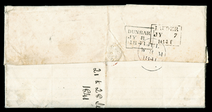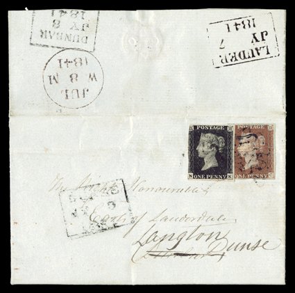 55 c imageThe famous "Daisy" July 7, 1841 folded entire bearing the world's first three adhesive postage stamps, entire written from Thirlstane Castle to the Earl of Lauderdale at Dunbar and franked with 1840 2p Blue, IB, Plate 1, then redirected to Dunse and further franked with 1840 1p Black, OK, Plate 6 and 1841 1p Red brown, JG, Plate 8, all cancelled with black Maltese Cross cancels, boxed "Lauder/JY 7/1841" and similar boxed "Dunbar/JY 8/1841" postmarks on reverse, boxed "Dunse/JY 9/1841" receiving handstamp on front, all quite strong and legible, tear to one back flap (not extending to front) and central file fold, very fine and simply stunning.Also included with this lot is an amazing companion cover dated July 7, 1841 similarly addressed and redirected, bearing an 1840 1p Black, NK (which originally formed a vertical pair on the "Daisy" cover!), Plate 6, and an 1841 1p Red brown, FC, Plate 8, both stamps creased by horizontal file fold and NK cut in a bit at left. This is a highly important companion piece to confirm both the authenticity of the "Daisy" cover and to offer additional evidence for the eventual usage of all three stamps on the one cover.The overall appeal and immense rarity of this cover cannot be overstated. Typically any three color franking from the classic period of philately is highly sought after and desired by collectors. But to have a three colored franking consisting of all three of the world's first postage stamps is simply beyond the wildest imagination of any collector. In our opinion, this historical cover ranks among the world's greatest rarities and shares the spotlight with some of the most famous and most valuable covers in the world - such as the remarkable Cape of Good Hope block of four of the 4p error of color on cover, or the stunning U.S. 1847 10c "Rush" cover - which are each valued into seven figures. There is no doubt this is an exhibition item without equal for the Line Engraved specialist/exhibitor. Accompanied by a 1996 BPA certificate; ex-"Daisy". (imagea) (imageb) (Image) Est. $300,000-400,000