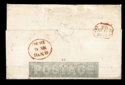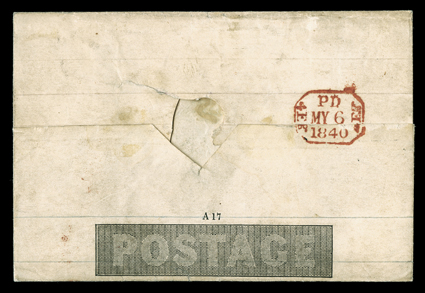 57 c imageMay 6, 1840, 1p letter sheet, A1, used from London, excellent strikes of oval "8 Nt 8/MY 6/1840" and boxed "PD/MY 6/1840" (over letter join) both in red on reverse, corresponding choice strike of red Maltese Cross at top center on front, some minor imperfections and perimeter splits at bottom, overall very fine and handsome for this rare and popular first day of usage; 1975 BPA certificate; ex-Shaida. (imagea) (Image) Est. $5,000-7,500