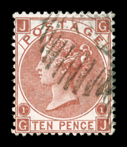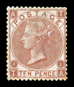 126 og 114 imageS.G. #114, 1867 10p Deep red brown, "abnormal" Plate 2, watermark spray, TA, an exciting mint example of this immensely rare stamp, of which only five mint or used examples are recorded, three of which are mint and one of these is housed in the Royal Collection (lettered RG), making this one of only two mint copies in private hands, extraordinarily well centered, strong rich color, o.g., lightly hinged, the accompanying certificate states the stamp is "stained" which, with all due respect, is so minimal (on the edges of the gum side) as to be completely unworthy of mention and of no relevance given this stamp's near unique status, overall very fine; one of the rarest stamps in all of Great Britain philately; 1991 BPA certificate; ex-"Kay-Jay" (Scott #53 var.). (Image) £22,000