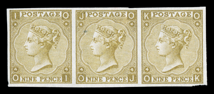 125 P 110P imageS.G. #110P (S.G. Spec. #J96 plate proof), 1865 9p Straw, Plate 4, imperforate plate proof on unwatermarked paper, OI-OK, horizontal strip of three, large margins all around, rich color, minor thin spot on position OJ, very fine; a rare and seldom seen plate proof, particularly as a multiple; 1996 BPA certificate; ex-Dr. Douglas Latto (Scott #46P). (Image) £5,400+