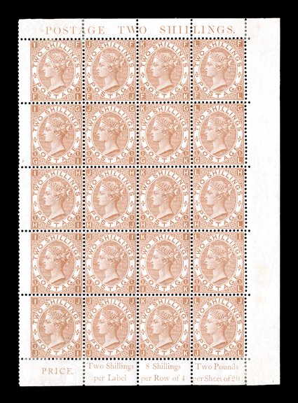 130 og/nhbl 121 imageS.G. #121, 1880 2/- Brown, Plate 1, watermark spray, the spectacular complete pane of twenty, lettered FI-JL, with inscriptions "POSTAGE TWO SHILLINGS" in top sheet selvage and "Price/Two Shillings per Label/8 Shillings per Row of 4/Two Pounds per Sheet of 20" in bottom selvage, magnificently centered, deep luxuriant rich color, o.g., amazingly at least twelve stamps are never hinged, couple light hinge reinforcements and two insignificant thin spots confined to the sheet selvage, lightly folded along horizontal perforations between second and third row, overall extremely fine and in an extraordinary state of preservation.In mid-1879 there were several color changes needed for stamps to conform with the Universal Postal Union's international color standard. One of the stamps affected was the Twopence Halfpenny, which would change from rosy mauve to blue, resulting in a conflict with the Two Shillings value, which was then currently printed in blue. Therefore, an order was made for new Two Shillings stamps in brown and they were delivered in February of 1880. However, they remained only in use for a mere six months, until July 16, 1880 when they were withdrawn from sale. From the moment the stamps were withdrawn from use, the Two Shilling Brown almost instantly became a scarce stamp and today it is recognized as one of the rarest stamps of the Surface Printed era. As a result of the short life span of the issue, combined with its high face value, mint multiples of this stamp are of the utmost rarity. In fact, apart from the unique complete pane offered here, the next largest multiple is thought to be only a pair. Even singles are difficult to come by, particularly as well centered as each of the singles found throughout this pane. And, never hinged singles are essentially unheard of, of which this pane contains at least twelve such examples.The magnificent complete pane is considered to be one of the most important mint multiples in British philately and has graced several important collections of the past, including The Earl of Crawford, Henry Nissen, Dr. Douglas Latto and Sir Gawaine Baillie. (Image) as singles £320,000+