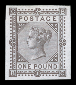 139 og 129 imageS.G. #129, 1878 £1 Brown lilac, watermarked Maltese Cross, BE, an exceptional certified mint example of this important high value rarity, being exceptionally well centered and with strong rich color, small part o.g., faint trace of a diagonal bend which is of little significance and not even mentioned on the accompanying certificate, very fine; 1974 BPA certificate; ex-Caspary, Lilly and Gibralter (Scott #75). (Image) £50,000