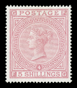 135 ng 127 imageS.G. #127, 1874 5/- Pale rose, Plate 2, watermark Maltese Cross, GH, handsome unused example, well centered, fresh color, regummed, very fine (Scott #57). (Image) £7,500