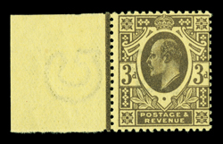 182 nh 277a imageS.G. #277a, 1911 3p Grey on lemon, perforated 14, Harrison & Sons, handsome left sheet-margin mint example of this very rare shade, wonderfully fresh, deep luxuriant color, centered a bit to right as often found, o.g., hinged in selvage only, stamp never hinged, fine; photocopy of a 1985 RPS certificate for a block of four, this being the top left stamp; ex-"Kay-Jay" (Scott #132c). (Image) £4,500