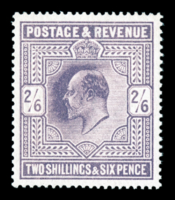 185 nh 315 imageS.G. #315, 1911 2/6p Dull greyish purple, Somerset House, superb mint single of this scarce shade, flawlessly centered within large margins, bright and fresh overall, o.g., never hinged, extremely fine; especially desirable both so choice and never hinged; 1994 Brandon certificate, with right sheet selvage subsequently removed (Scott #139b). (Image) £750