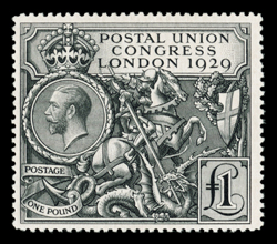 198 og 438 imageS.G. #438, 1929 £1 Black Postal Union Congress, deep rich color and a crisp impression, well centered, o.g., lightly hinged, very fine (Scott #209). (Image) £750