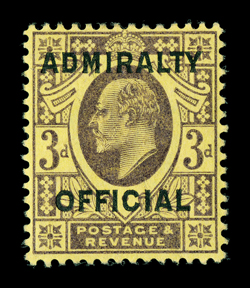 224 og O111 imageS.G. #O111, 1904 2 1/2p Ultramarine, "Admiralty/Official", rich color, rather well centered, o.g., faint trace of hinging, fine; 1973 RPS certificate (Scott #O82). (Image) £1,200