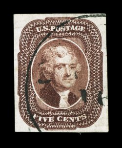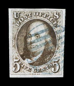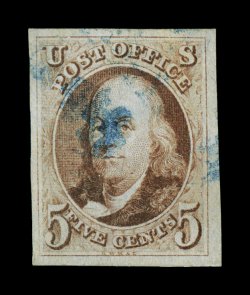 1 Ou 1 image#1, 5c Red brown, a lovely used single possessing particularly large margins all around, deep rich color and detailed impression as well, light blue cancel, extremely fine; encapsulated PSE certificate (XF 90; SMQ $960.00). (Image) $600.00