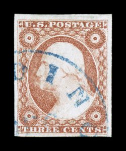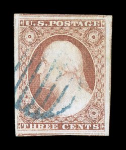 11 O 8 image#8, 1c Blue, Ty. III, position 99R2, a gorgeous used example of this highly sought-after classic rarity, possessing mostly large to huge margins (just touching at bottom right), including a sizable portion of a sheet margin at bottom, which allows for the distinctive Ty. III design characteristics to show extraordinarily well, lovely "powder" blue color and a well defined impression, beautifully postmarked by a desirable red carrier cancel, completely sound but for a tiny and insignificant surface scuff in the bottom margin mentioned for accuracy only, still very fine and quite choice; a select used example of the rare Type III from position 99R2, which produced the finest and most distinctive example of this type; clear 1978 PF certificate and a 2006 PF certificate. (Image) $12,500.00