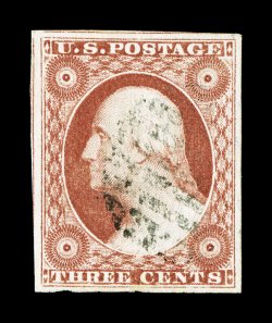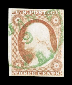 14 O 11 image#11, 3c Dull red, four ample to very large margins, strong rich color, wonderfully cancelled by a bright green town pmk., extremely fine; 1999 PF certificate. (Image) $189.00