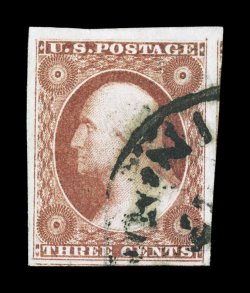 15 Ou 11 var. image#11 var., 3c Brownish carmine, lovely used single featuring very large to huge margins all around, including a portion of the sheet margin at top and portions of the frame lines of adjacent stamps at right and bottom, excellent clarity of impression and unusually strong color in a deep shade, portion of black c.d.s. cancel, extremely fine and eye catching; 2007 PSE certificate (XF-Superb 95; SMQ $385.00). (Image) $20.00